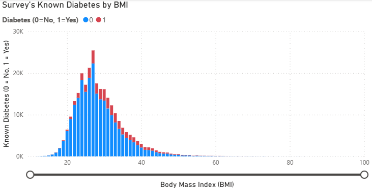 As you can see that the survey shows that samples from BRFSS–which is solely conducted in the US–have portion of samples with known diabetes by 14% approximately. Aligned with claims from WHO. - Known diabetes by Body Mass Index (BMI)