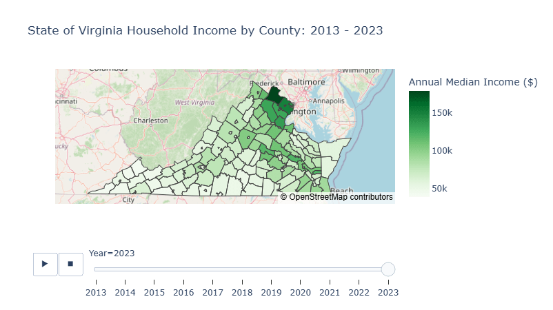 title="State of Virginia Household Income by County: 2013 - 2023",