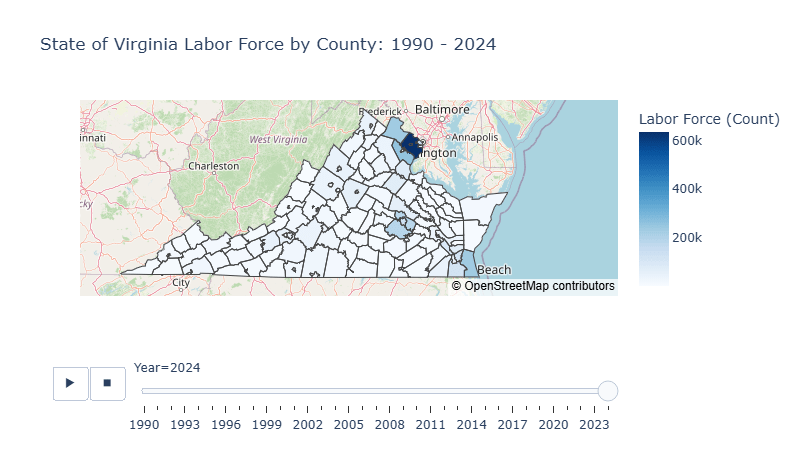 title="State of Virginia Labor Force by County: 1990 - 2024",