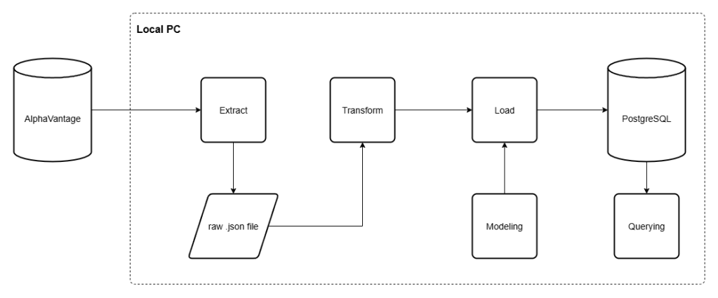 At this point, this project focuses on building the ETL pipeline using the public API from AlphaVantage. With the extraction process, we will get the API response in the form of JSON, and we store it in a local machine accordingly. Then, transforming and load that data into a local PostgreSQL database. We also add ‘Modeling’ layer to add the new database table in case we created the new one.